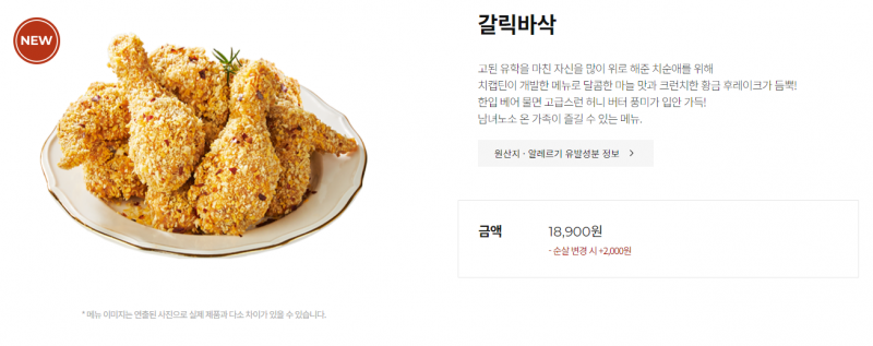 - 브랜드명 해시태그 삽입해주세요. - <갈릭바삭> - 1. 달콤한 마늘맛과 버터 풍미가 가미된 메뉴. - 2. 크리스피에 골든 크런치 후레이크가 뿌려져 바삭함을 끝까지 유지할 수 있는 제품 - 3. 한입 베어 물면 고급스런 허니 버터 풍미가 입안 가득하며 남녀노소 온 가족이 즐길 수 있는 제품 - <레드갈릭바삭> - 1. 크리스피에 스파이시 갈릭 후레이크가 뿌려져 바삭함을 끝까지 유지할 수 있는 제품 - 2. 바삭한 식감과 함께 매콤하면서도 중독적인 맛을 살린 제품. - 3. 꽈리고추가 토핑 |
