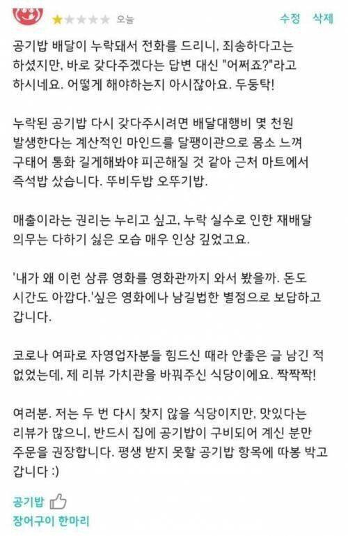 공기밥 누락시키고 배달해버린 음식점