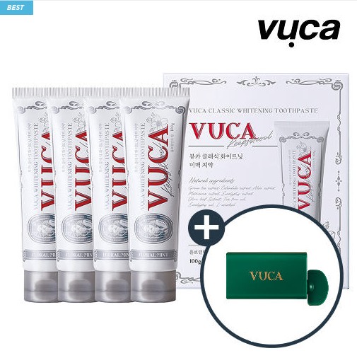 체험상품 - 뷰카[네이버]클래식 미백치약 플로럴민트 100g 4개 + 뷰카 스탠드 치약짜개 디스펜서 1개