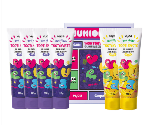 - 뷰카[N쇼핑]어린이 고불소 비건 치약 포도향110g 4개+바나나향2개 불소 키즈치약 아기